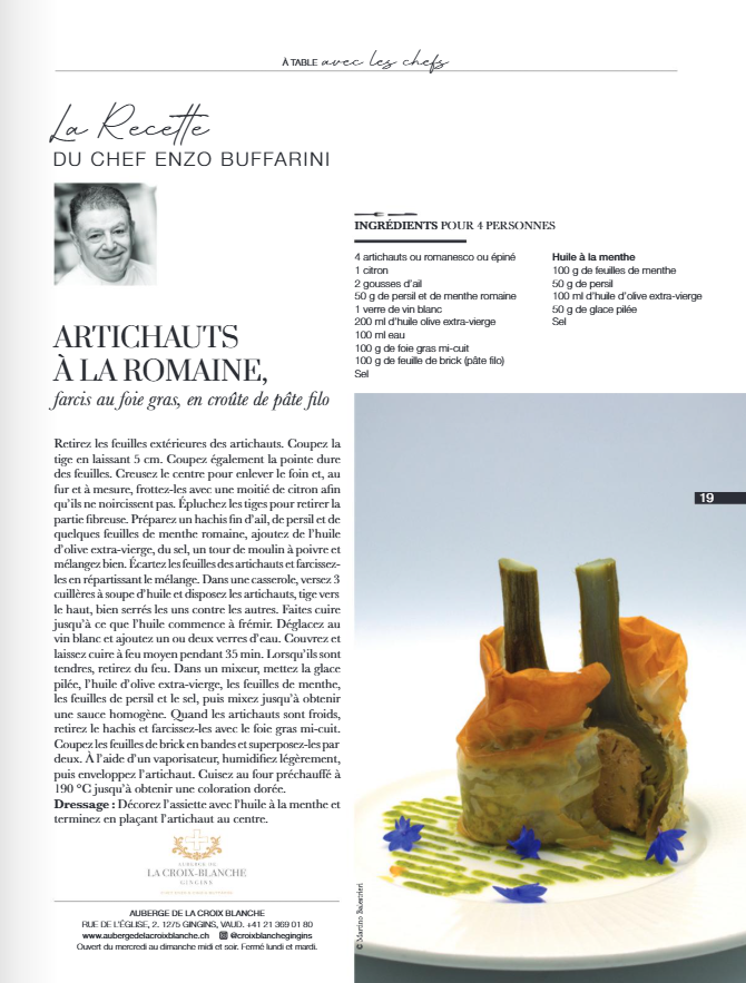 Quand la cuisine italienne rencontre l’élégance du foie gras, cela donne une recette d’exception signée Enzo Buffarini. Publiée dans le dernier numéro de Miam Magazine, cette revisite des artichauts à la romaine conjugue finesse, croustillant et fraîcheur aromatique.