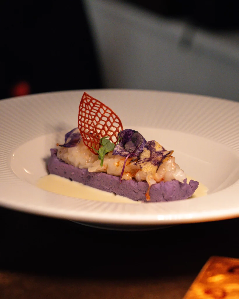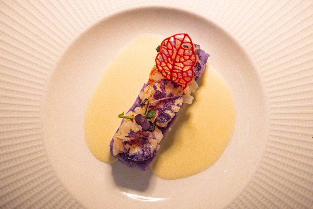 Nuage de pommes de terre violettes, tartare de gambes et émulsion au Franciacorta