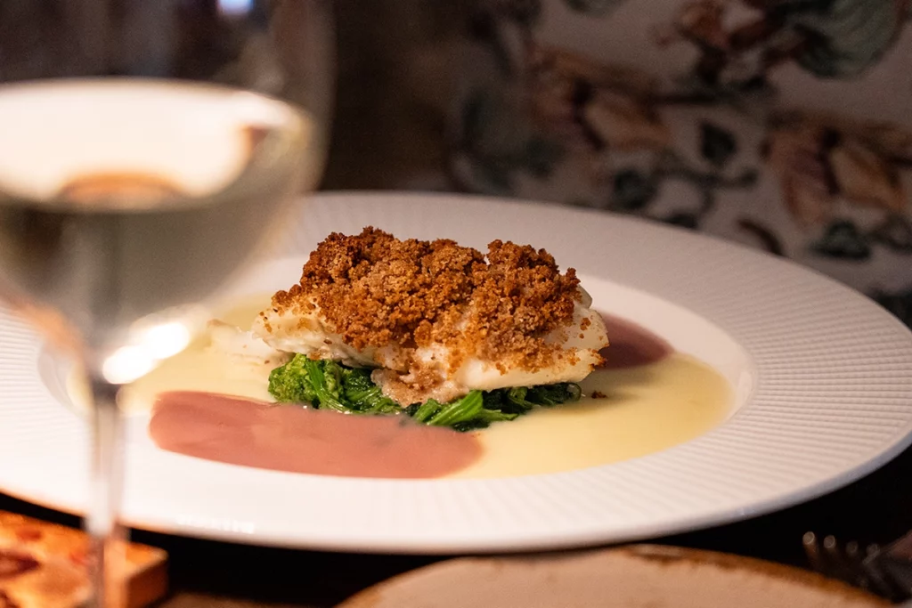 Cœur de cabillaud Skrei gratiné aux olives taggiasche, cime di rapa, duo de sauces au citron et à l’oignon rouge de Tropea